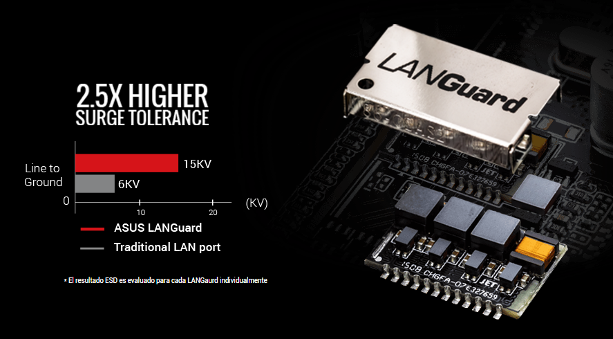 ASUS LANGuard es la protección de red a nivel hardware que emplea tecnología de acoplamiento de señales y capacitores premium anti-EMI montados en la superficie que aseguran mayor confiabilidad en la conexión y mejor salida, además de que protege de descargas electrostáticas a los componentes.