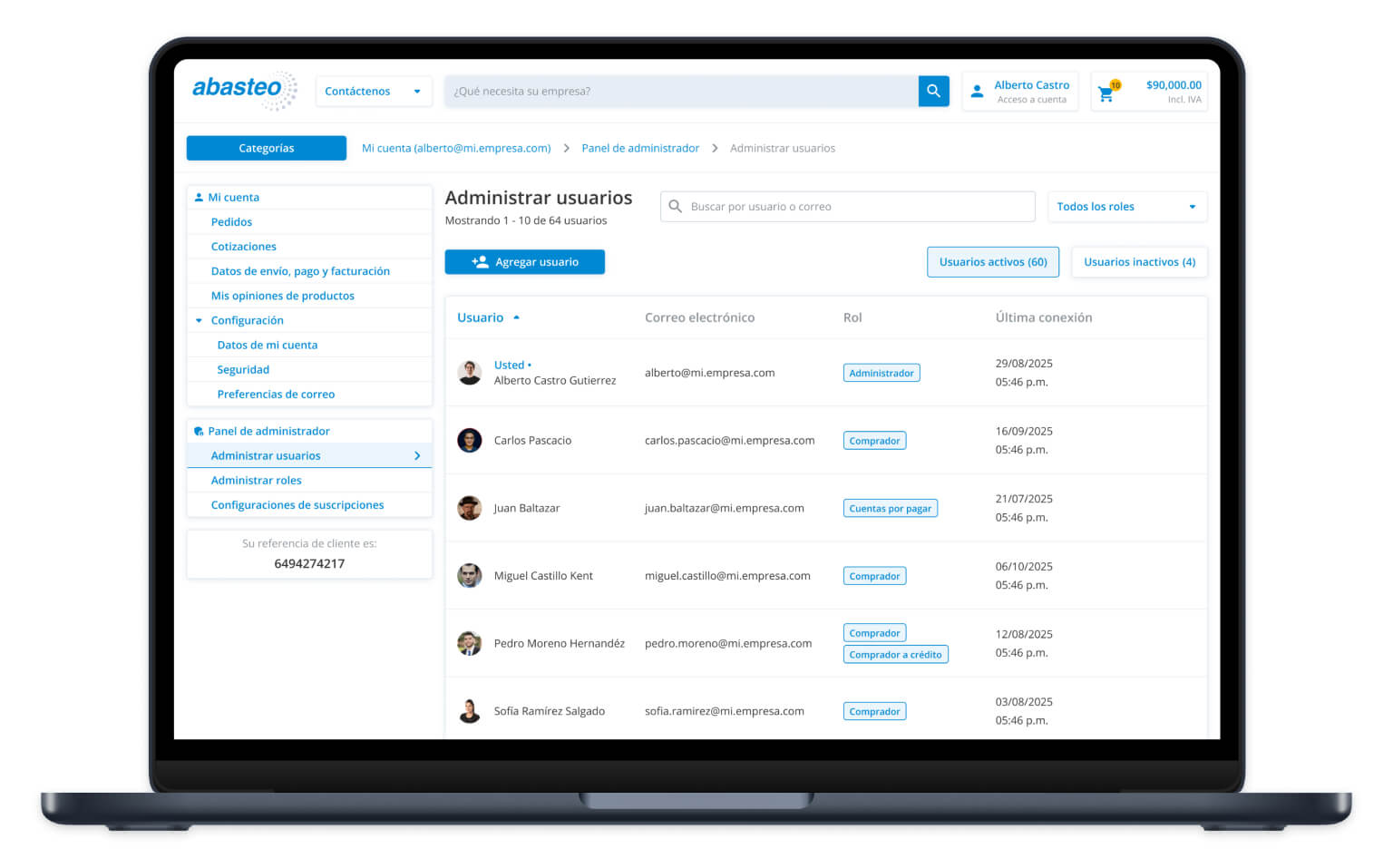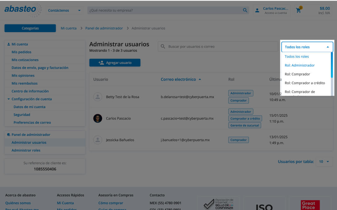 Si su empresa ya cuenta con usuarios registrados en Abasteo, podrá visualizar una lista de usuarios vinculados a la misma referencia de cliente que usted. Por defecto, todos ellos tendrán asignado el rol de “Comprador”.Según las necesidades y estructura de su organización, puede modificar los roles de los usuarios para adaptarlos a su modelo de gestión.