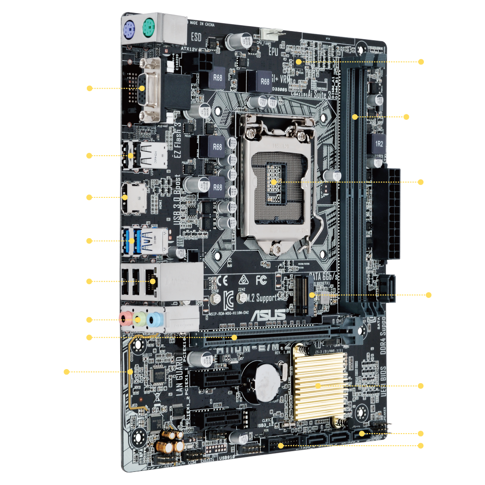 El chipset Intel® H110 Express es un diseño de chipset simple compatible con procesadores de la 6ª generación Intel® Core™ i7/i5/i3/Pentium®/Celeron® para zócalo LGA1151. Gracias al uso de unos enlaces en serie de punto a punto que permiten aumentar tanto el ancho de banda como la estabilidad, este chipset se beneficia de un rendimiento mejorado. Además, el chipset H110 incluye soporte nativo hasta 4 puertos USB 3.0 con una velocidad hasta 10 veces superior que USB 2.0. El chipset Intel® H110 Express también es compatible con las funciones iGPU para que disfrutes del rendimiento gráfico integrado más avanzado de Intel.