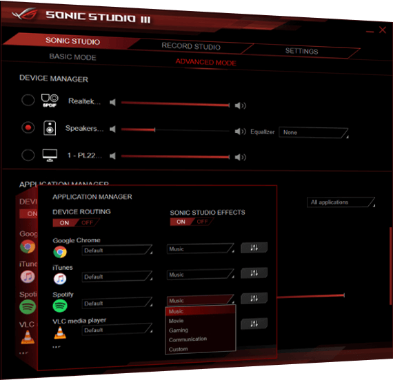 La estación de efectos de audio ROG Sonic Studio III ha sido actualizada con las totalmente nuevas características tanto de ruteo de los puertos de transmisión para salidas diferentes como para ajustes en las preferencias a nivel de aplicación para perfiles de audio y mejoras en el filtrado de ruido para conversaciones con total claridad.