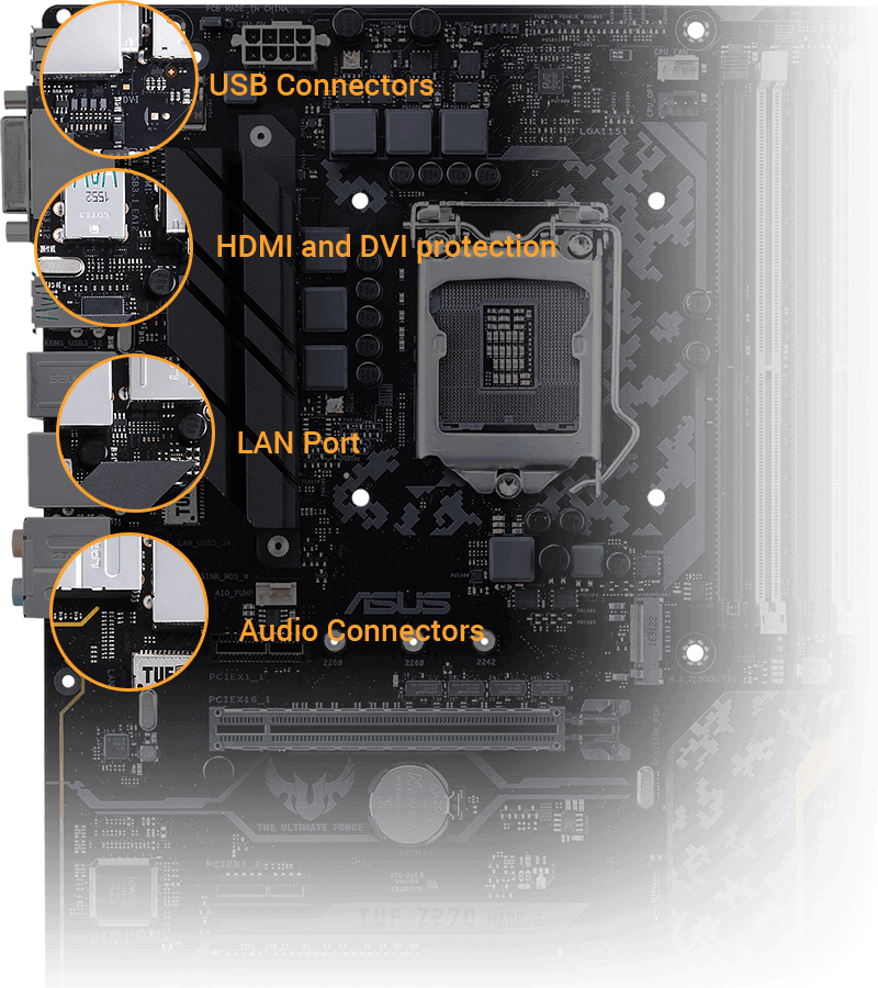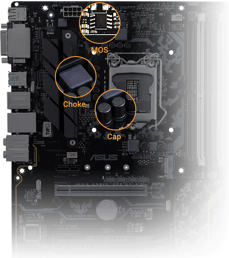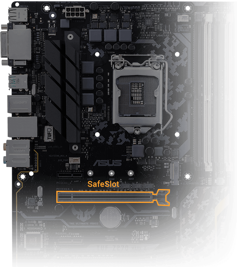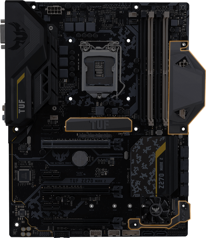 Y con la TUF Z270 Mark 2 llevamos el concepto de camuflaje digital más allá - al plasmar un patron digital inspirado en la milicia directo en la tarjeta! Evocadora de fuerza, el nuevo diseño de TUF Z270 Mark 2 te inspira para tu proxima batalla. Ya sea que lo quieras para trabajar o jugar, asegúrate de tener una base sólida para tu equipo con la Fuerza Mejorada de TUF!