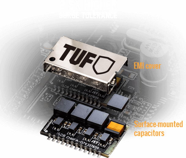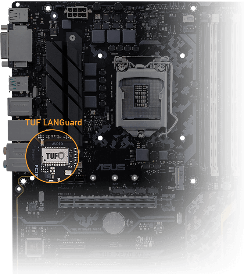 El conector Ethernet en la TUF Z270 Mark 2 está protegido por TUF LANGuard, una innovación de grado militar que integra tecnología de emparejamiento de señal con capacitores premium montados en la superficie - protegiendo la tarjeta madre de sobretensiones y electricidad estática.