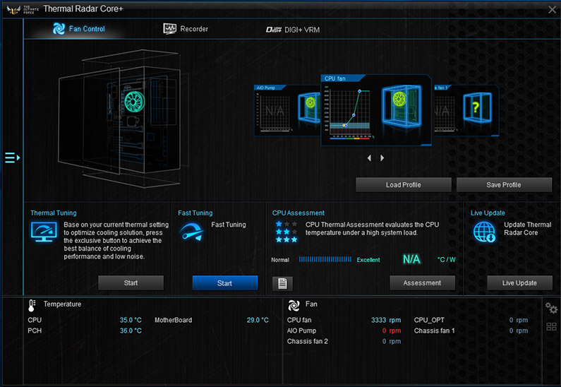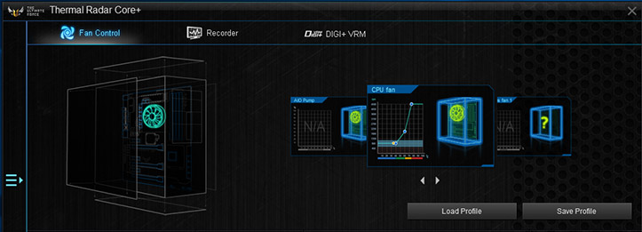 Thermal Radar 2+ te permite controlar los ventiladores de las tarjetas gráficas ASUS además de los ventiladores de tu gabinete! Multiples sensores integrados te permiten monitorear las temperaturas de la tarjeta madre y de otros componentes importantes en tiempo real - así puedes hacer ajustes manualmente u optimizar automáticamente con un solo click.