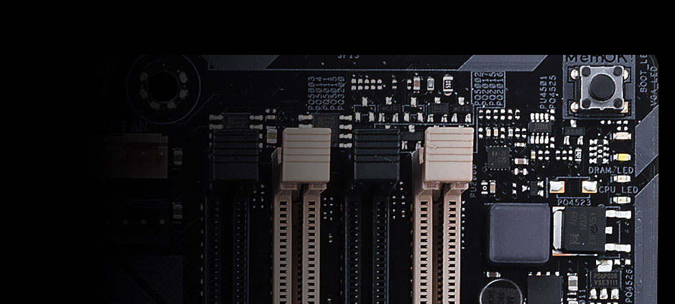 Implementando un layout de DRAM completamente nuevo, la tercera generación de ASUS T-Topology ofrece nuevas dinámicas de overclock DDR4 que te permiten llevar las frecuencias de tu memoria más lejos que nunca - ¡hasta 3866MHz si todas las ranuras de memoria están siendo utilizadas!