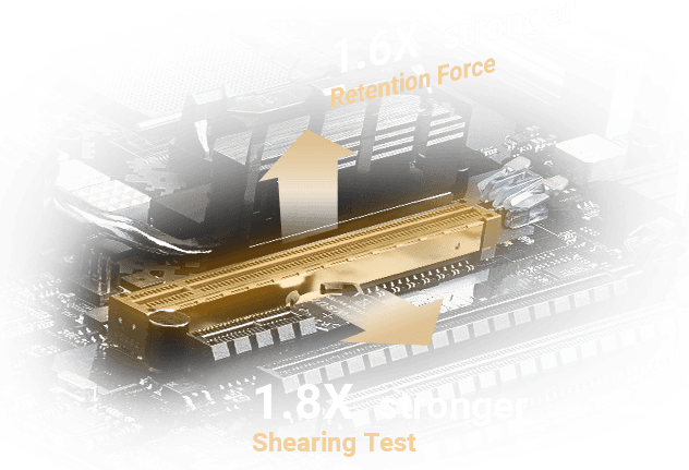 SafeSlot es la ranura PCIe® reinventada por ASUS y diseñada para proveer retención superior y mejor resistencia. Manufacturada en un solo paso usando un nuevo proceso de modelado por inyección, integra la ranura con el metal dándote una ranura mucho más resistente firmemente anclada al PCB por puntos de soldadura adicionales.