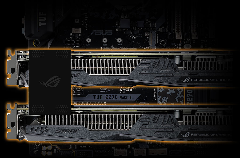 TUF Z270 Mark 2 incluye dos ranuras PCI Express® que soportan puenteo SLI de tarjetas gráficas. Con 1.5X mayor ancho de banda de transferencia contra configuraciones de una sola ranura, TUF Z270 Mark 2 soporta inmersión rápida y brillante para configuraciones multi-monitor.