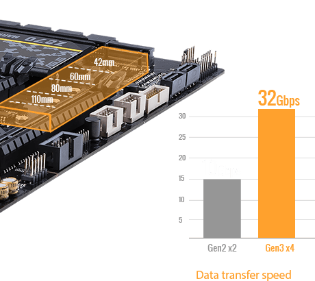 TUF Z270 Mark 2 cuenta con dos conectores M.2 integrados — ambos soportan tecnología Intel Rapid Storage y configuraciones RAID para velocidades de transferencia de hasta 32Gbps, actualización automática de aplicaciones y arranque de sistema en velocidades excepcionales!