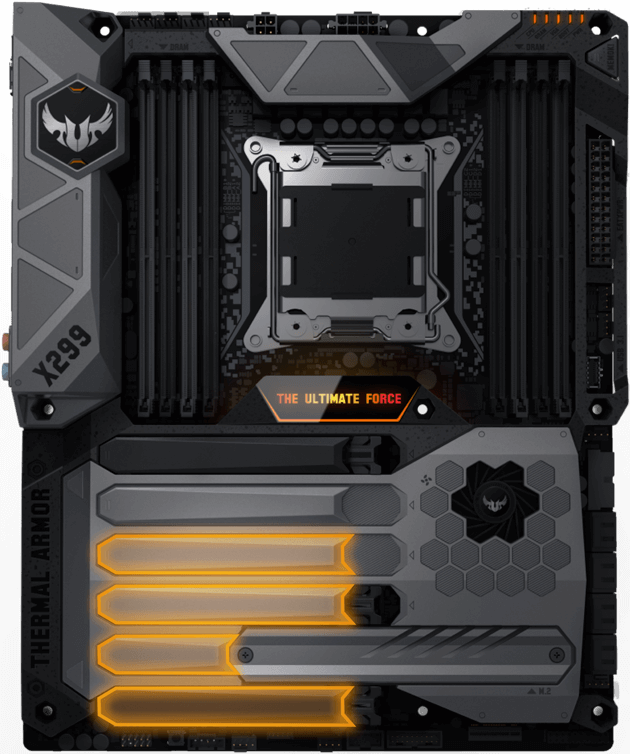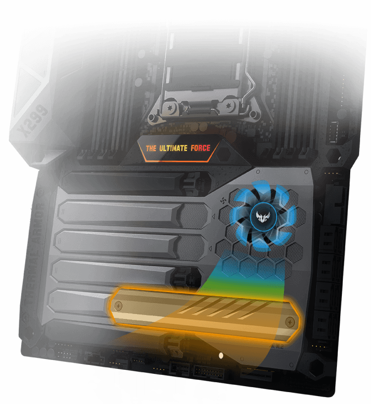 TUF X299 Mark 1 ha sido cuidadosamente diseñado para aumentar el flujo de aire y la disipación de calor para mantener la temperatura de los componentes vitales tan fresca como pueda estar. La armadura Térmica TUF pone un ventilador en el área de PCH que dirige el flujo de aire hacia un disipador de calor M.2 ultra-eficiente, reduciendo las temperaturas de SSD hasta 25 ° C - lo que significa un rendimiento de almacenamiento óptimo y una longevidad de la unidad mejorada.