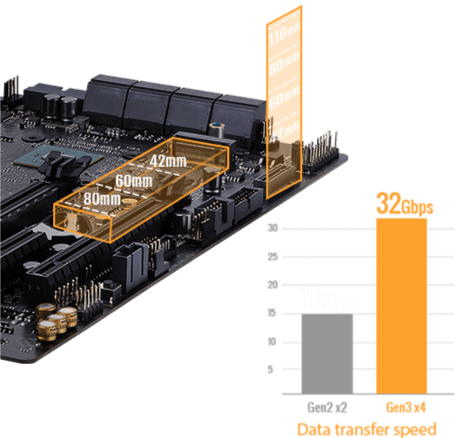 Con x4 PCI Express 3.0 / 2.0 de ancho de banda, M.2 soporta velocidades de transferencia de datos de hasta 32Gbps. Es la opción perfecta para un sistema operativo o unidad de aplicación, proporcionando un acceso rápido a los datos.