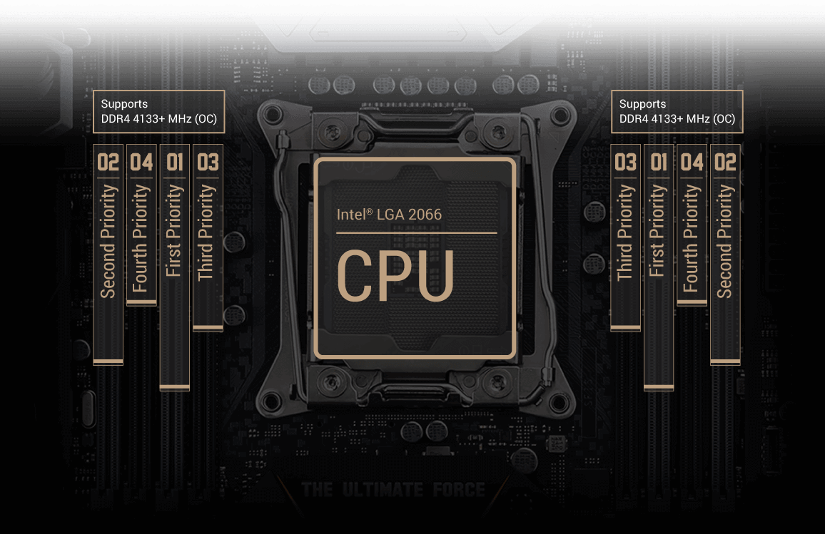 Procesadores Intel Core X-series (De 6 o más núcleos): 4-channel (8-DIMM), ranuras 44/28 PCI Express 3.0/2.0. Procesadores Intel Core X-series (De 4 núcleos): 2-channel (4-DIMM), ranuras 16 PCI Express 3.0/2.0.