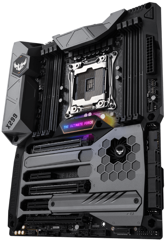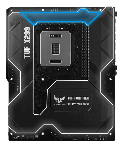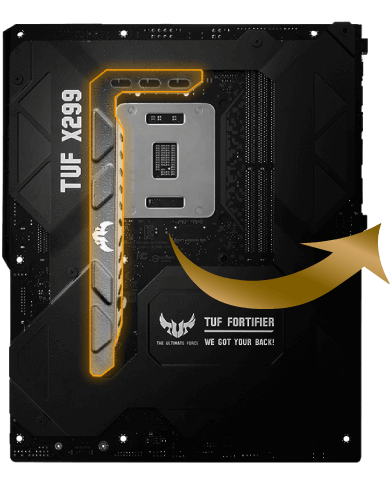 TUF X299 Mark 1 ofrece una gran resistencia y refrigeración a través de un exclusivo Fortificador TUF - una placa trasera reforzada que añade rigidez estructural a través de la placa para asegurar que la placa base no se dobla bajo el peso de tarjetas gráficas pesadas y enfriadores de CPU, minimizando el riesgo de circuitos dañados por inclinación y doblamiento.