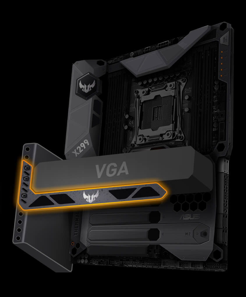 El sujetador VGA TUF de la X299 Mark 1 elimina la fea y potencialmente perjudicial pestaña de la tarjeta gráfica, soportando la placa base para evitar curvarse y doblarse. El sujetador TUF VGA está fabricado a partir de una sola pieza de chapa fuerte y es capaz de soportar hasta 15 kg - ¡Por lo que proporciona un apoyo serio incluso para la tarjeta gráfica más pesada!