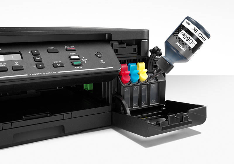 Tanque de tinta incorporado de fácil uso. Ahorro continuo usando las botellas de tinta originales Brohter..
